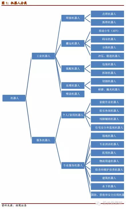 机器人专家从机器人应用环境出发,将机器人分为两大类,即工业机器人和服务机器人。工业机器人根据用途不同,大致可以分为焊接机器人、搬运机器人、喷漆机器人、涂胶机器人、装配机器人、码垛机器人、切割机器人、自动牵引车(AGV)机器人、净室机器人等。而服务机器人则是除工业机器人之外的、用于非制造业并服务于人类的各种先进机器人,主要包括个人/家用服务机器人和专业服务机器人。其中,个人/家用机器人主要包括:家庭作业机器人、娱乐休闲机器人、残障辅助机器人、住宅安全和监视机器人等;专业服务机器人主要包括:场地机器人、专业清洁机器人、医用机器人、物流用途机器人、检查和维护保养机器人、建筑机器人、水下机器人,以及国防、营救和安全应用机器人等等。